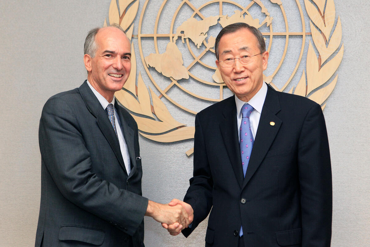 Secretary-General Ban Ki-moon (right) meets with Charles Petrie, his Executive Representative for Burundi and Head of the UN Integrated Office in Burundi (BINUB). Mr. Petrie is also UN Resident Coordinator, Resident Representative, Humanitarian Coordinator and Designated Official for Burundi.