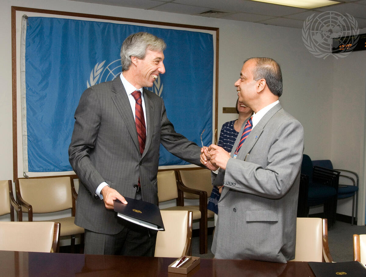Atul Khare (right), Assistant Secretary-General for Peacekeeping Operations, and João Gomes Cravinho, Secretary of State for Foreign Affairs and Cooperation of Portugal, meet to sign the Memorandum of Understanding on the United Nations Standby Arrangements System.