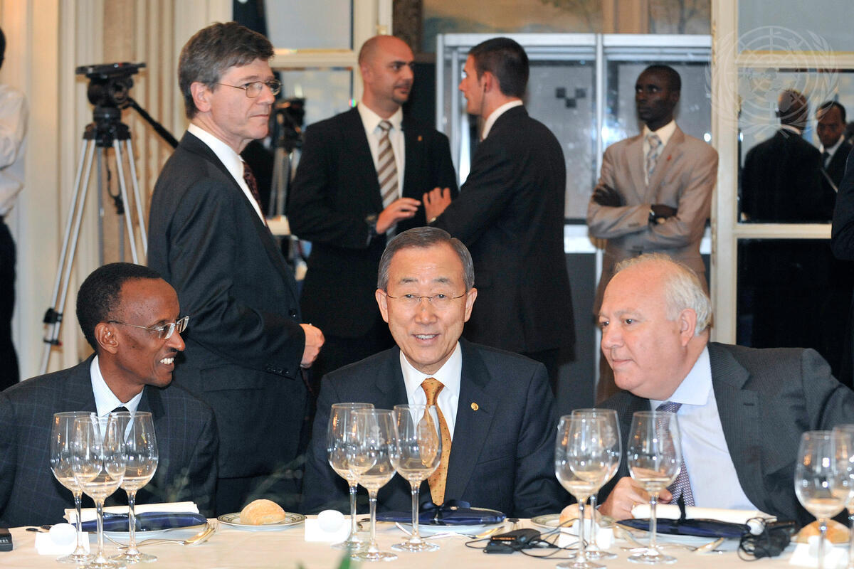 Secretary-General Ban Ki-moon (centre) attends a luncheon in Madrid, Spain, for the Millennium Development Goals (MDG) Advocacy Group, a team of world leaders and personalities assembled by Mr. Ban in June 2010. He is flanked by Paul Kagame (left), President of the Republic of Rwanda and Co-chair of the Group, and Miguel Ángel Moratinos Cuyaubé, Minister for Foreign Affairs of Spain. Standing left is Jeffrey Sachs, Mr. Ban's Special Adviser on the MDGs and member of the Group.