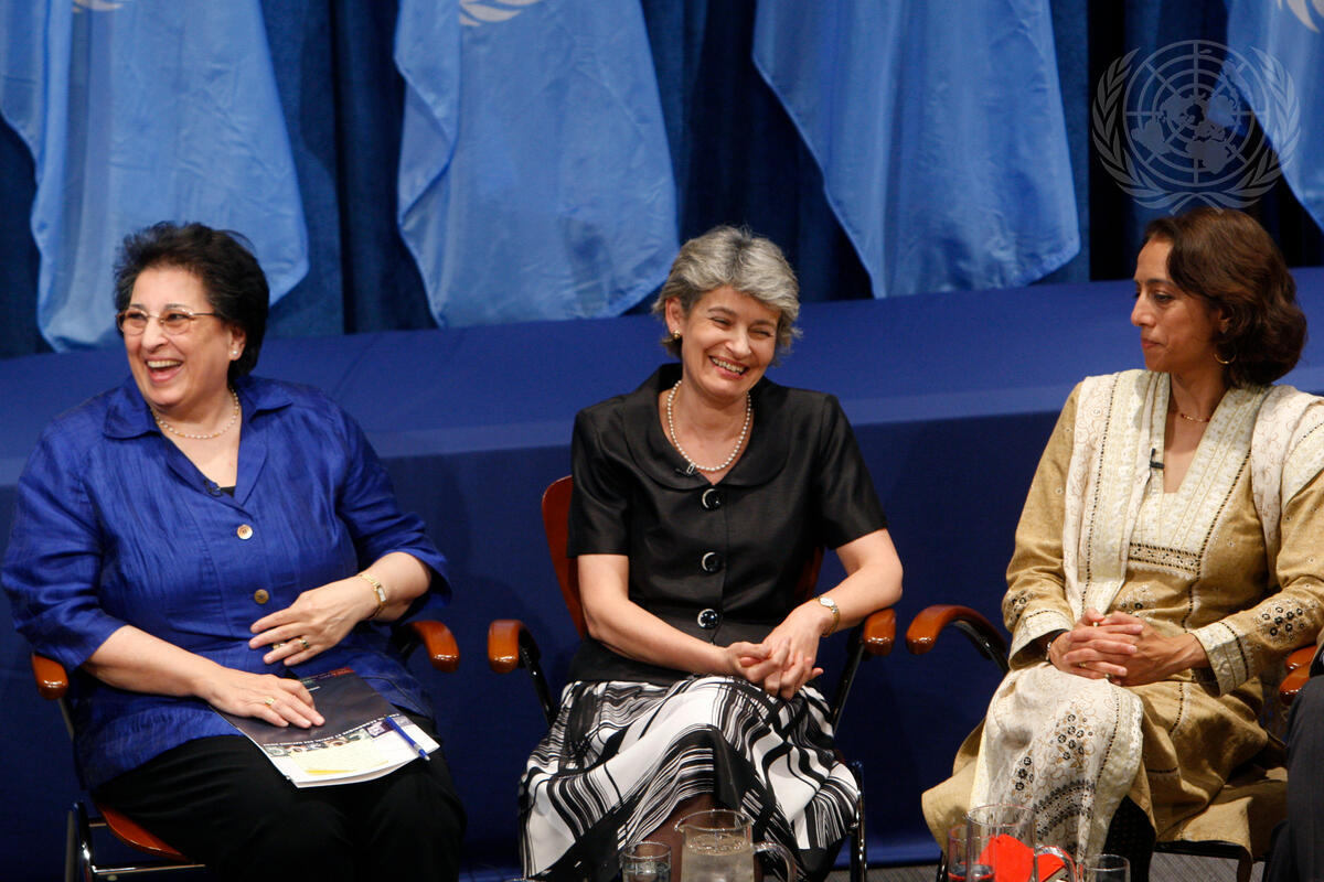From left to right: Thoraya Ahmed Obaid, Executive Director of the United Nations Population Fund (UNFPA); Irina Bokova, Director General of the United Nations Educational, Scientific and Cultural Organization (UNESCO); and Kavita N. Ramdas, President and Chief Executive Officer of the Global Fund for Women; participate in a UN TV debate, ""Face to Face: Women's Empowerment, Development Cooperation and Culture"".
