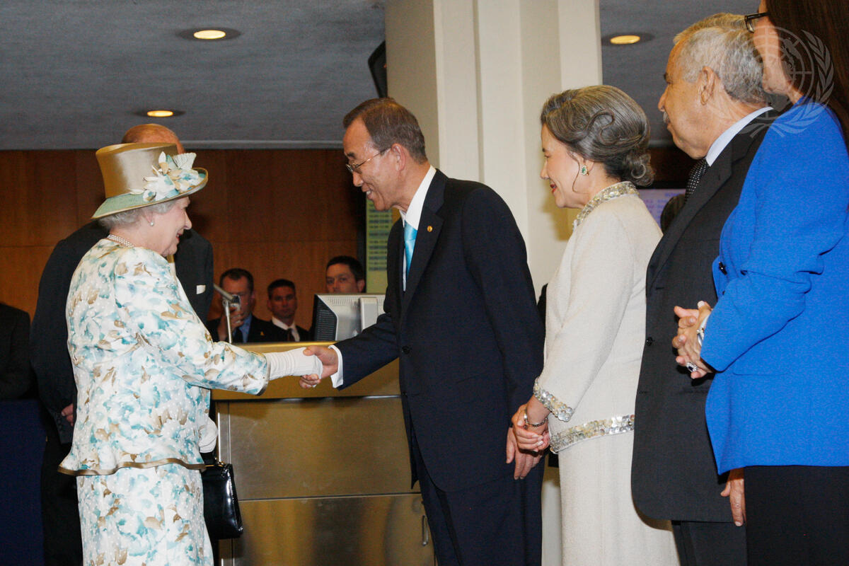 Queen Elizabeth II of the United Kingdom (left) is greeted by Secretary-General Ban Ki-moon during her first visit to the United Nations in more than 50 years. Also pictured are (right to left), Aisha Treki, wife of General Assembly President Ali Abdussalam Treki; Mr. Treki; and Yoo Soon-taek, Mr. Ban's wife.