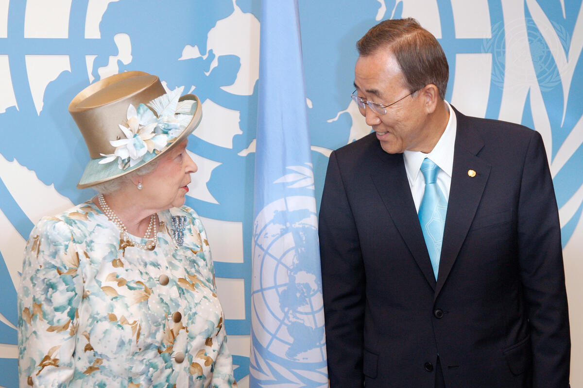 Secretary-General Ban Ki-moon (right) meets with Queen Elizabeth II of the United Kingdom.