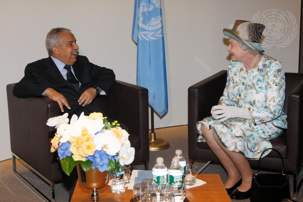 Ali Abdussalam Treki (left), President of the sixty-fourth session of the General Assembly, meets with Queen Elizabeth II of the United Kingdom.