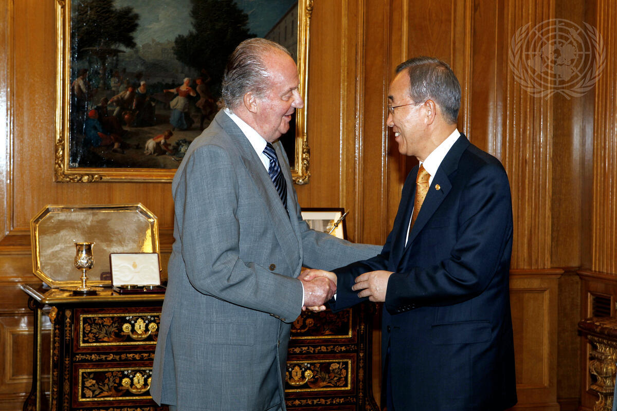 Secretary-General Ban Ki-moon (right) meets with King Juan Carlos I of Spain, at Zarzuela Palace, the primary residence of the Spanish monarchy, in Madrid, Spain.