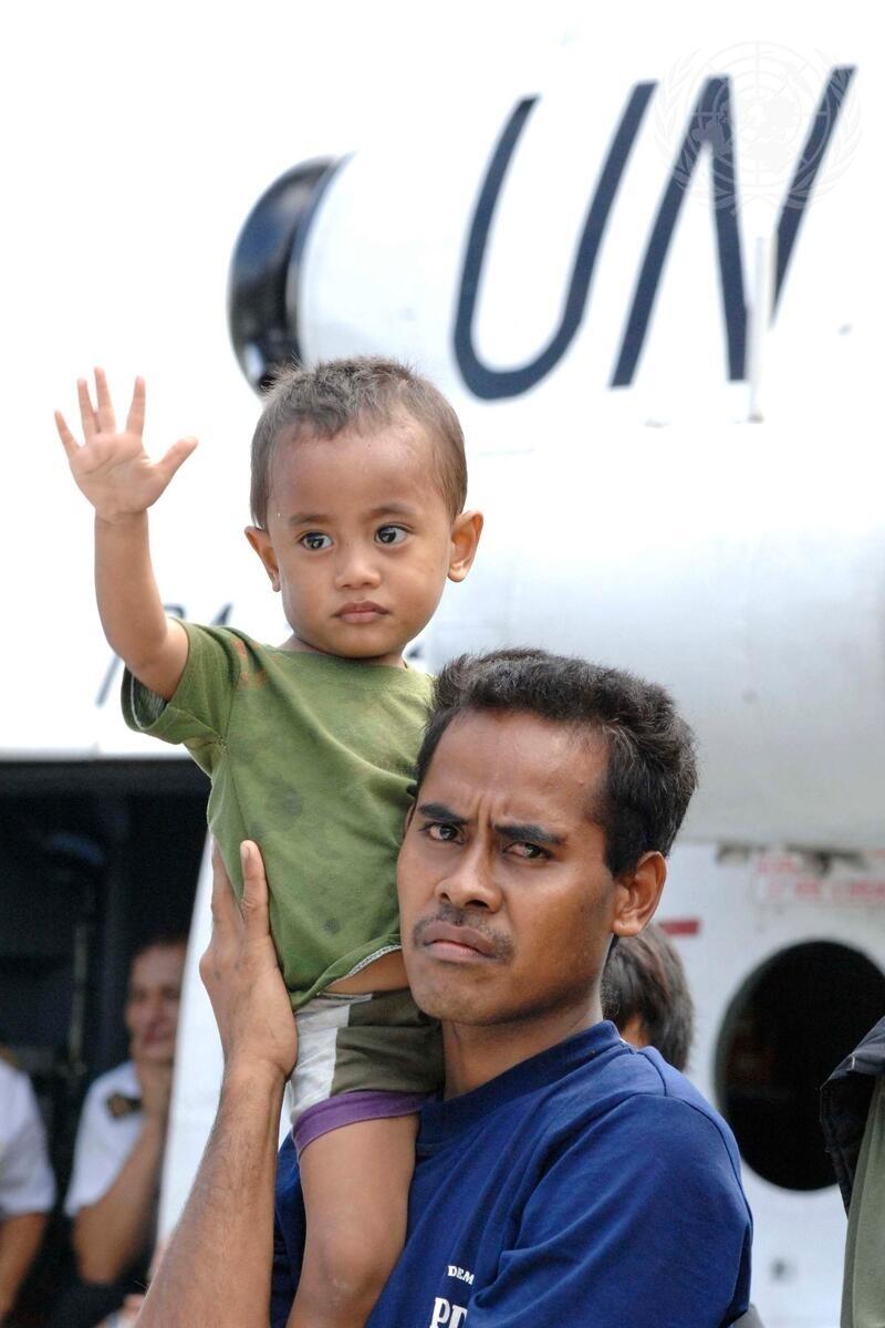 Helicopters from the United Nations Integrated Mission in Timor-Leste (UNMIT) land in Uatucarbao, a town severely affected by recent heavy rains and floods, delivering relief supplies in conjunction with the Timor-Leste National Disaster Centre. Over 230 families in area towns have been touched by the downpours, with some communities cut off by flooding. Pictured here are a father and child beside a relief helicopter.