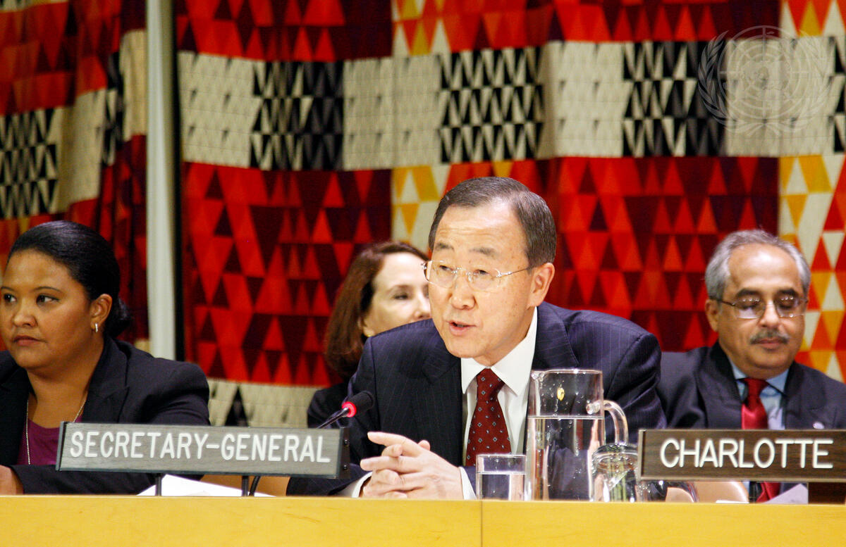Secretary-General Ban Ki-moon speaks at ""Giving Voice to the Victims and Survivors of Human Trafficking"", an event at UN Headquarters spotlighting the testimonies of four victims of human trafficking, from Nepal, Uganda, the United Kingdom and Venezuela. High Commissioner for Human Rights Navi Pillay, who hosted the event, stressed the importance of not only listening to the victims' experiences but also hearing ""what kind of action they would like to see taken to combat human trafficking"".