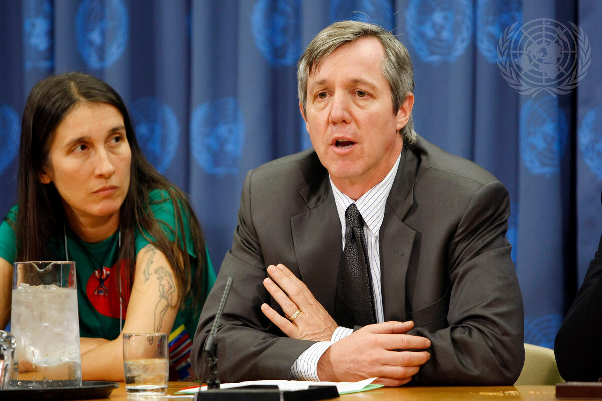 Anthony Banbury (right), Assistant Secretary-General for Field Support, addresses an introductory press conference on the ""UN Day Concert 2009: A Tribute to Peacekeeping"", to take place this evening at UN Headquarters. Beside him is one of the concert's performers, singer Andrea Echeverri.