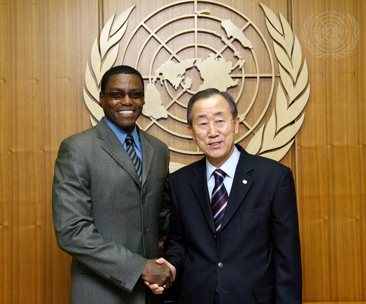 Secretary-General Ban Ki-moon (right) meets with Carl Lewis, athlete and Food and Agriculture Organization (FAO) Goodwill Ambassador.