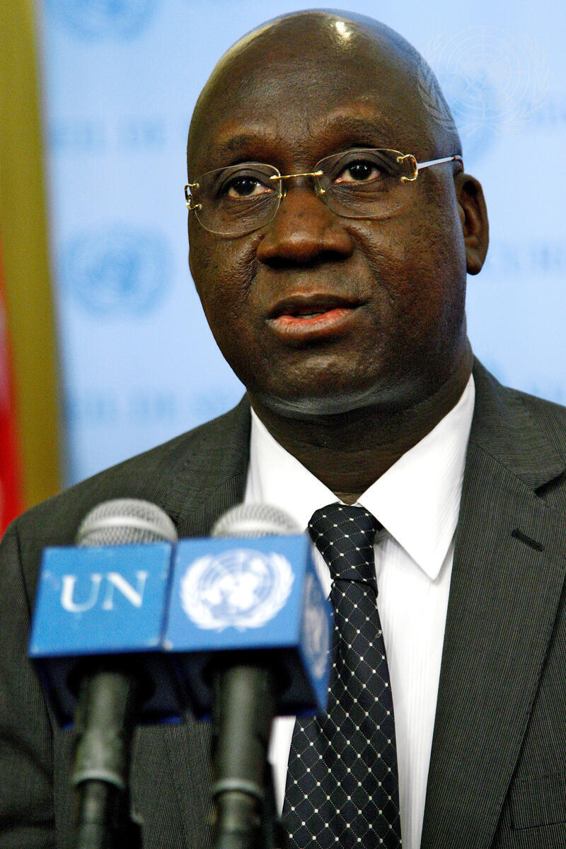 Ilahiri A. Djédjé, Permanent Representative of Côte d'Ivoire to the United Nations, briefs news correspondents following a Security Council meeting on his country.