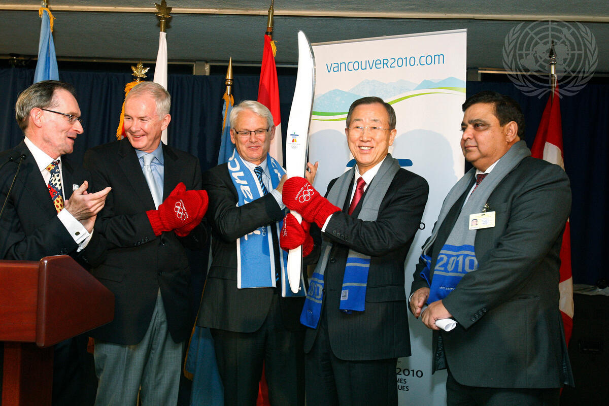 Secretary-General Ban Ki-moon (second from right), holding the Vancouver 2010 Olympic Torch, poses for a group photo at a UN Headquarters event dedicated to Olympic Truce ahead of the Vancouver 2010 Olympic Winter Games. In the spirit of the Truce, Mr. Ban stressed the importance of a halt to all fighting during the Olympic Games. Mr. Ban is seen here with, from left to right, John McNee, Permanent Representative of Canada to the United Nations; John Furlong, Chief Executive Officer of the Vancouver Organizing Committee for the 2010 Olympic and Paralympic Winter Games (VANOC); and Gordon Campbell, Premier of British Columbia.