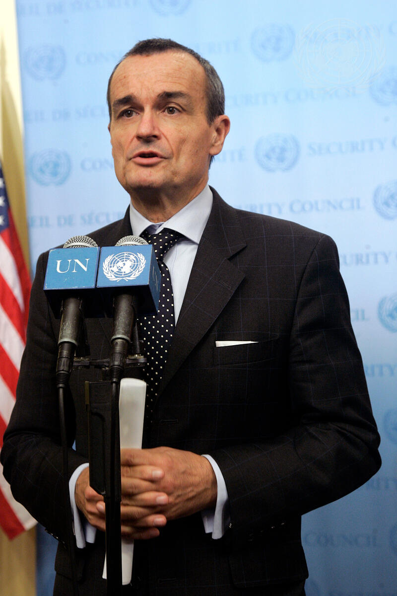 Gérard Araud, Permanent Representative of France to the United Nations, speaks to journalists regarding the President of the Security Council's statement in condemnation of the killings that occurred in Conakry, Guinea on September 28 2009, when the army opened fire on civilian protesters.