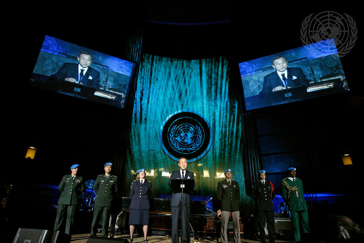 Secretary-General Ban Ki-moon (centre) addresses the audience gathered at UN Headquarters for the "UN Day Concert 2009: A Tribute to Peacekeeping". On stage with him are UN Peacekeepers representing all those to whom the concert pays tribute.