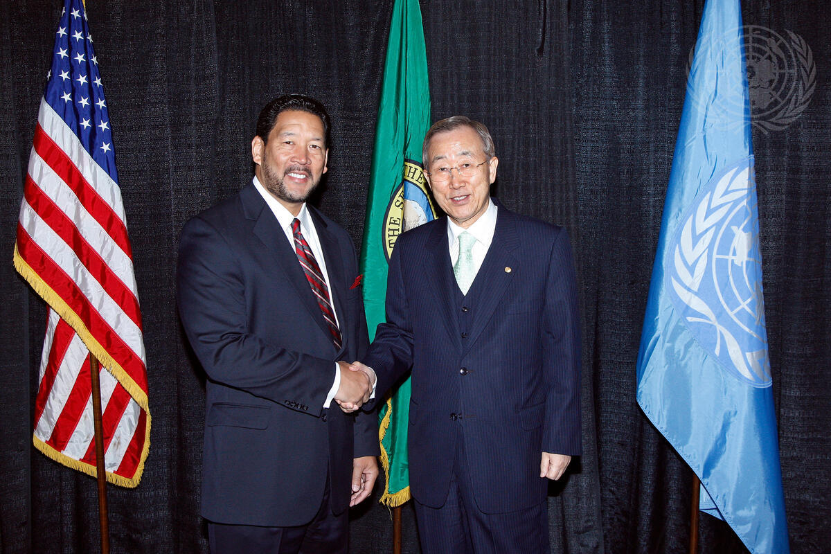Secretary-General Ban Ki-moon (right) meets with Bruce Harrell, Seattle City Councilmember.