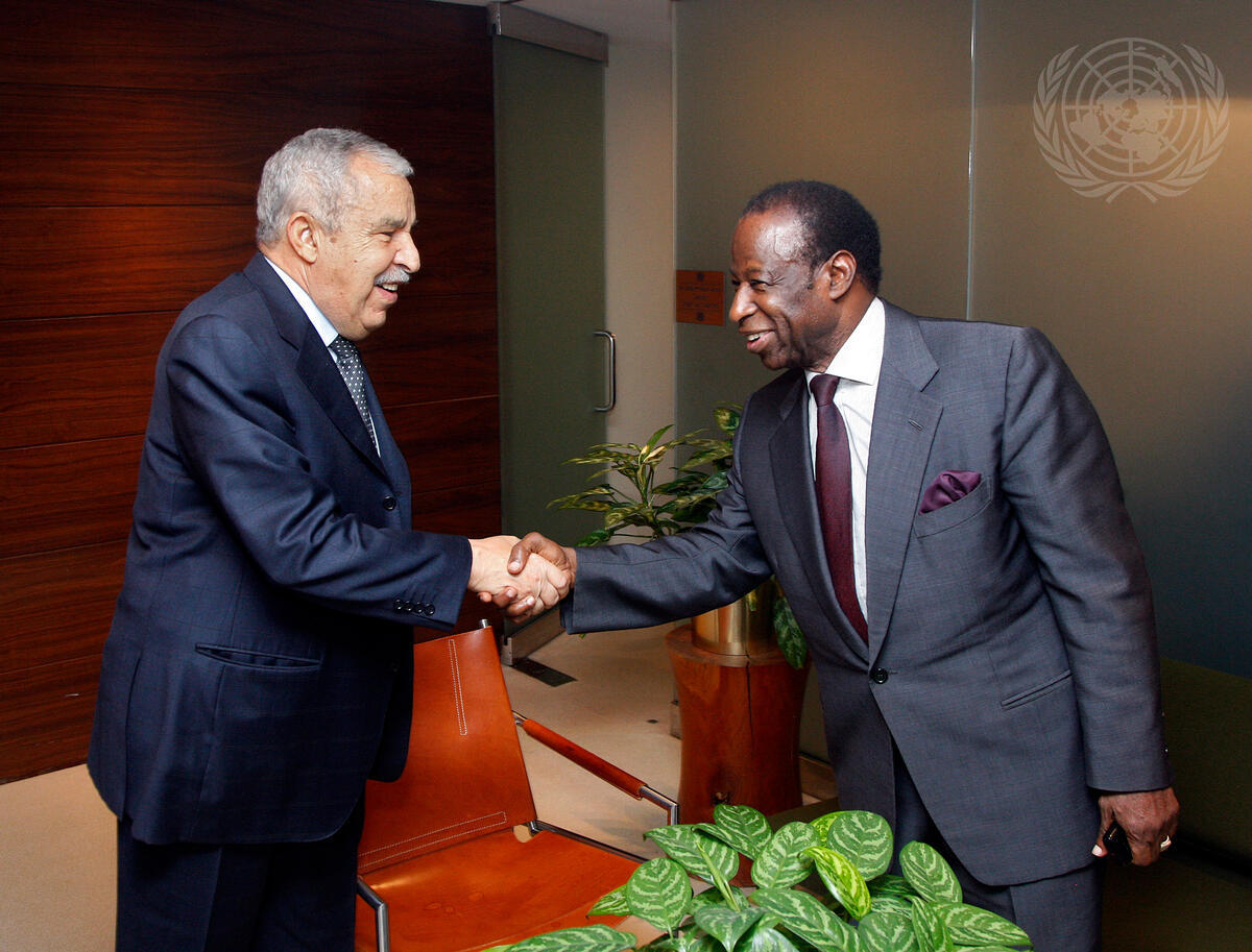 Ali Abdussalam Treki (left), President of the sixty-fourth and current session of the General Assembly, meets with Amara Essy, President of the forty-ninth session of the General Assembly.