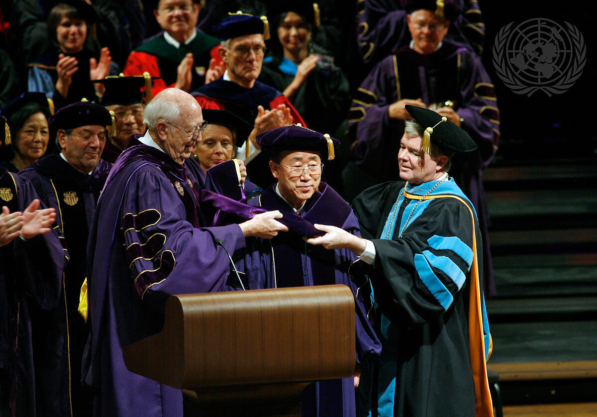 Secretary-General Ban Ki-moon (centre) is ""hooded"" (symbolizing the attainment of his Doctor of Laws degree) by William Gates, Sr. (left), member of the University of Washington Board of Regents and father of Microsoft co-founder Bill Gates, and University of Washington President Mark Emmert (right), inside Meany Hall for the Performing Arts at the University of Washington, Seattle.
