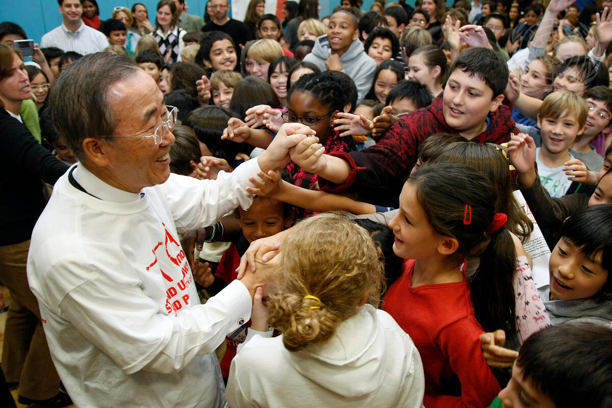 Secretary-General Ban Ki-moon (left) is mobbed by students at the United Nations International School (UNIS) in New York, where he delivered a speech in support of ""Stand Up Against Poverty"", a campaign to urge world leaders to meet the Millennium Development Goals.