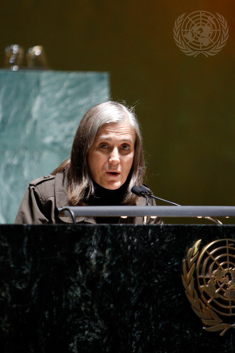 Amy Goodman, award-winning journalist and host of radio/TV broadcast Democracy Now!, addresses a special screening of the documentary, ""Children of War"", part of the “Zero under 18” campaign against the recruitment of child soldiers.