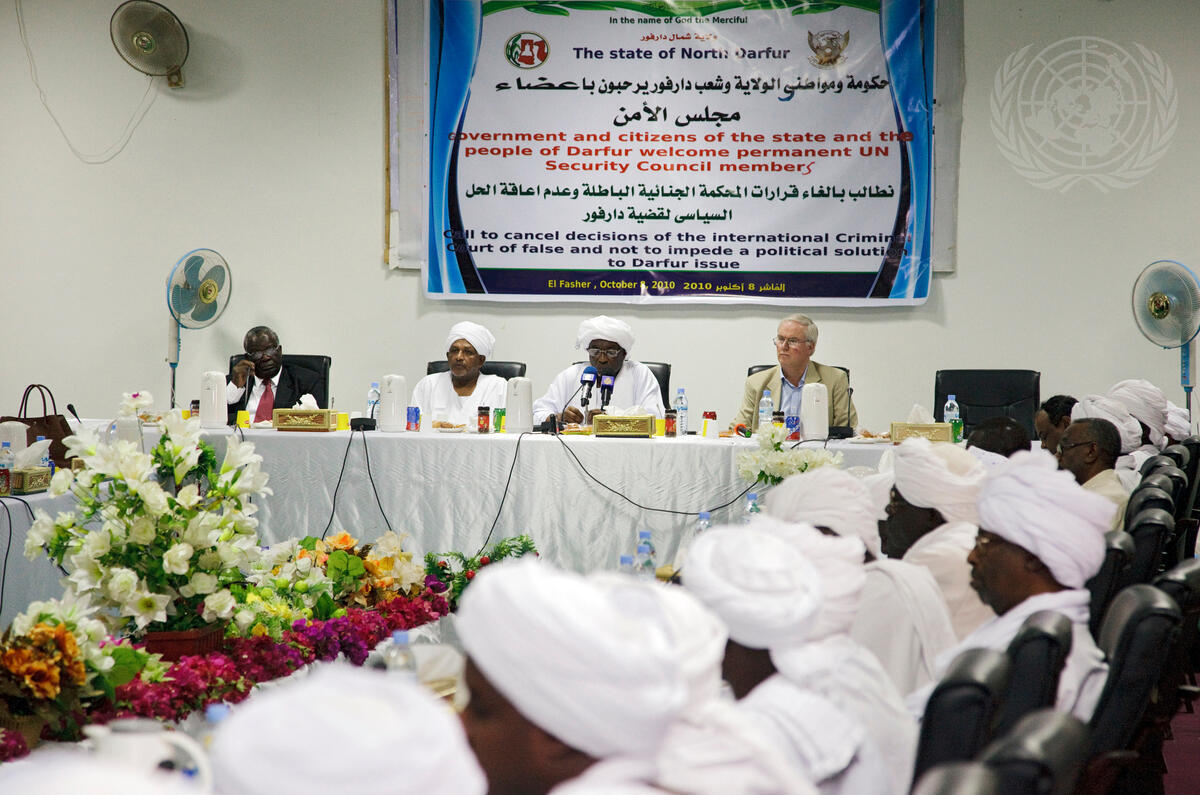 Mark Lyall Grant (head of table, right), Permanent Representative of the United Kingdom to the UN, attends a meeting in El Fasher, Sudan, with Ibrahim Gambari (left), Joint Special Representative for the African Union-United Nations Hybrid Operation in Darfur (UNAMID); Osman Mohammed Yousif Kibir (second from right), Wali (Governor) of Sudan’s North Darfur state; and other North Darfur officials. Mr. Grant was part of a Security Council delegation visiting Sudan to reaffirm international support for the implementation of the country’s Comprehensive Peace Agreement.