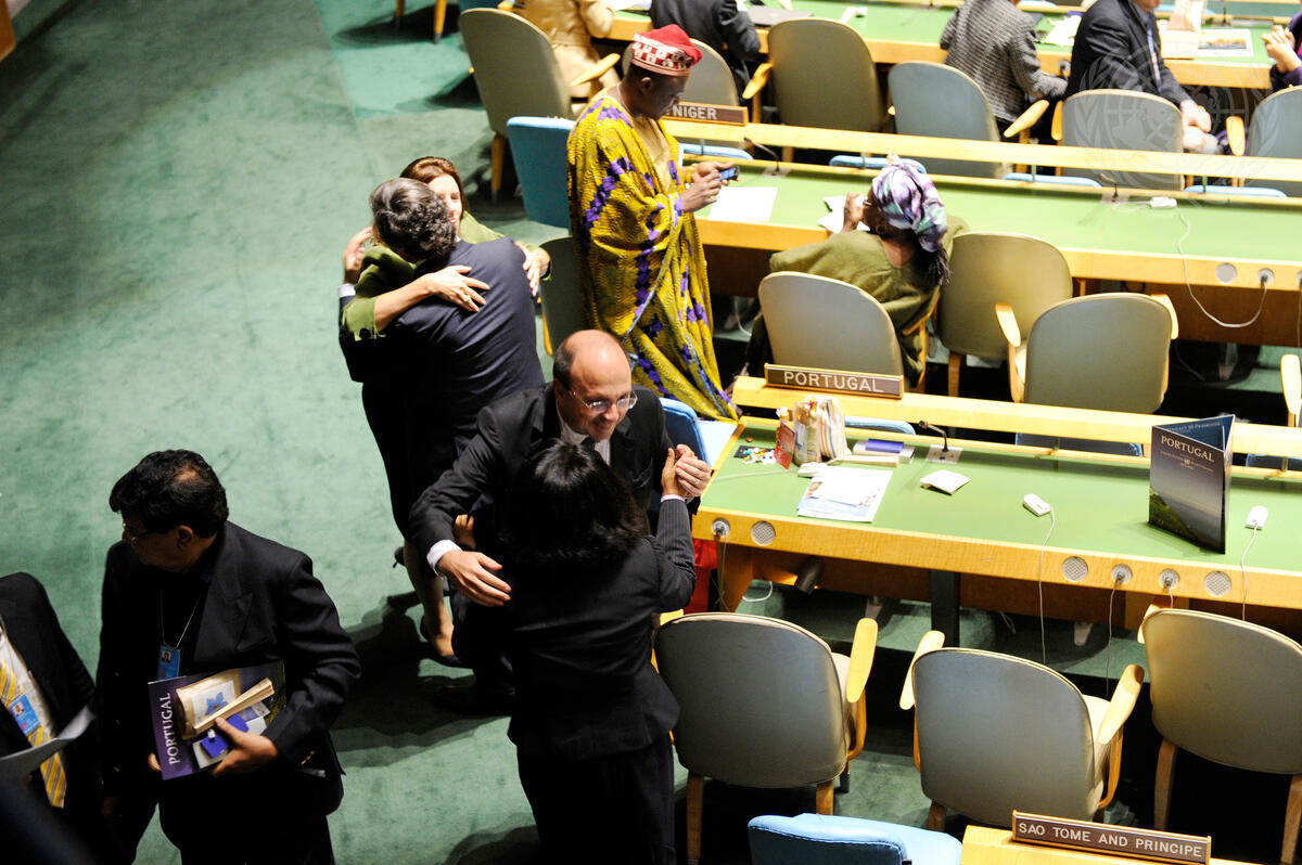 The delegation of Portugal receives congratulations in the General Assembly Hall, upon Portugal's election by the Assembly to a two-year term on the Security Council, which begins in January 2011. Four other states -- Colombia, Germany, India and South Africa -- were similarly elected to non-permanent Council seats.