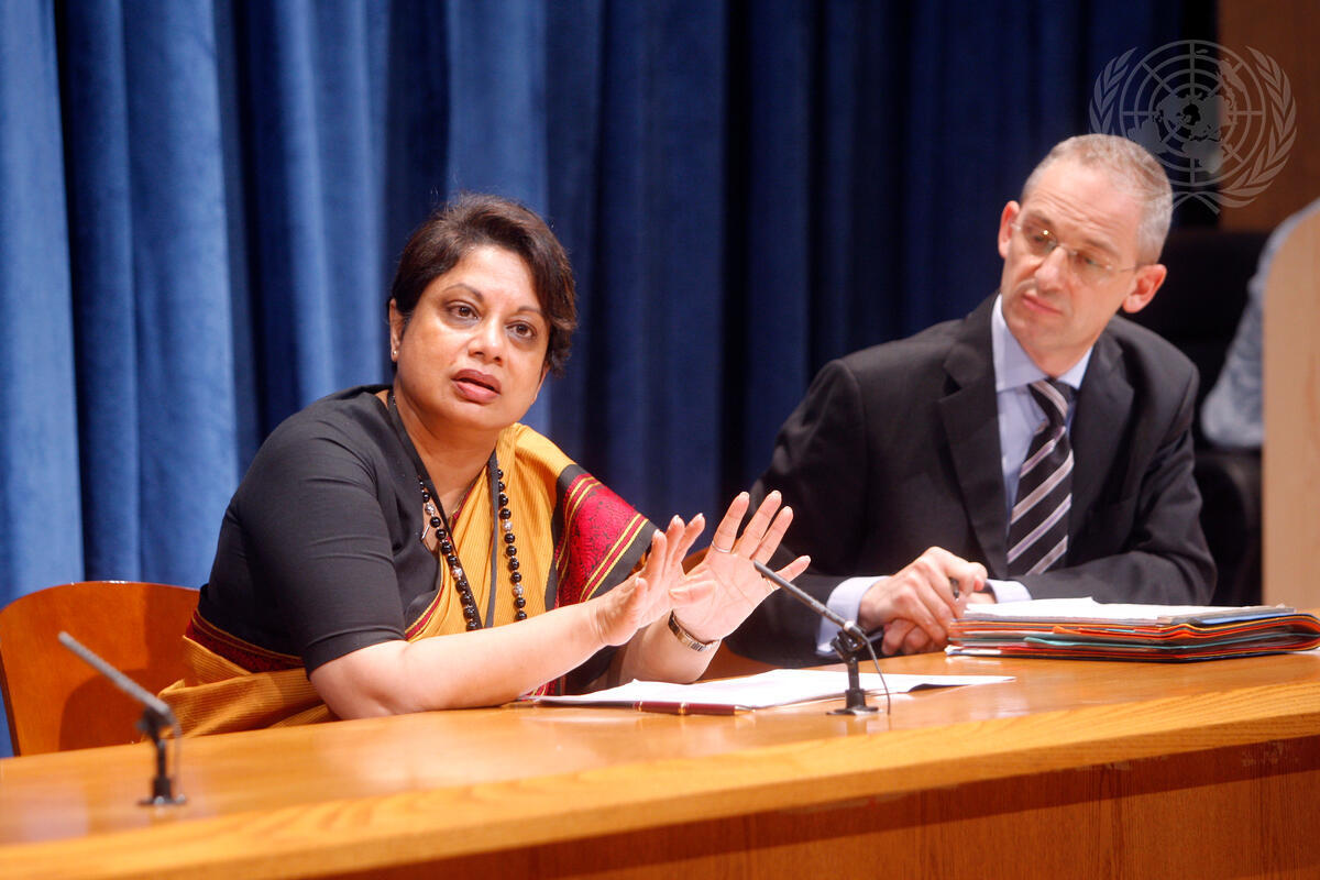 Radhika Coomaraswamy, Special Representative of the Secretary-General for Children and Armed Conflict, briefs correspondents on her upcoming report to the General Assembly and the “Zero under 18” campaign to achieve universal ratification of the Optional Protocol to the Convention on the Rights of the Child on the Involvement of Children in Armed Conflict by 2012. Pictured next to Ms. Coomaraswamy is Martin Nesirky, Spokesperson for Secretary-General Ban Ki-moon.