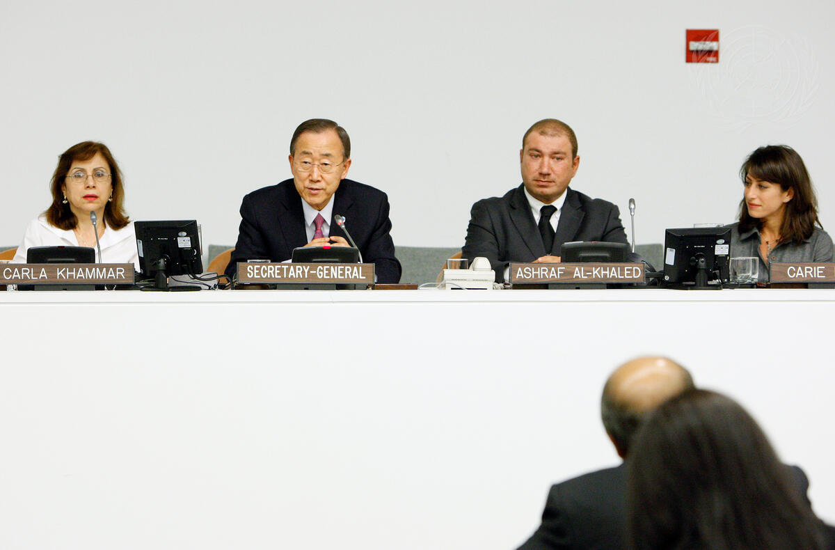 Secretary-General Ban Ki-moon addresses a panel discussion following the screening of an award-winning documentary film, “Killing in the Name”, on victims of terrorist attacks. Also on the panel (from left): Carla Khamma, Senior Programme Advisor for the UN Development Programme (UNDP) and terrorist attack survivor; Ashraf al-Khaled, terror survivor and one of the film’s subjects; and Carie Lemack, producer of the documentary and co-founder of the Global Survivors Network (GSN).