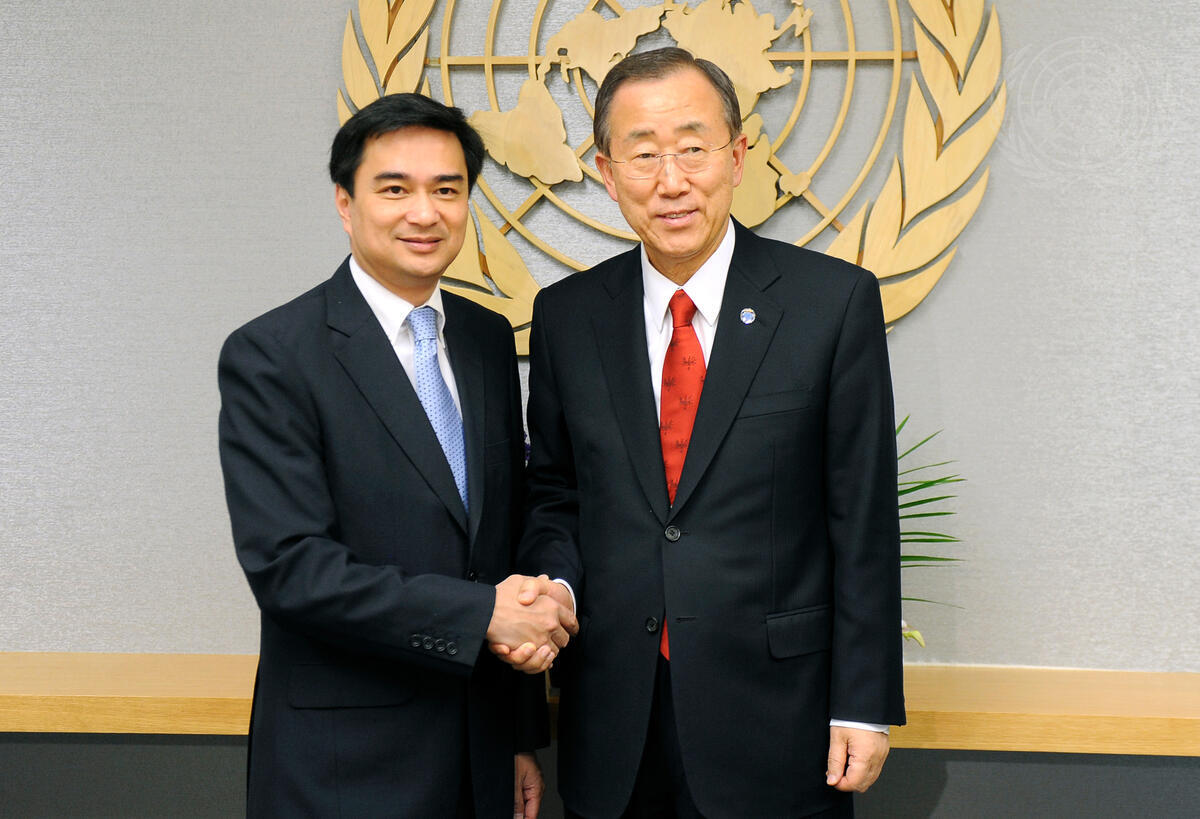 Secretary-General Ban Ki-moon (right) meets with Abhisit Vejjajiva, Prime Minister of Thailand.