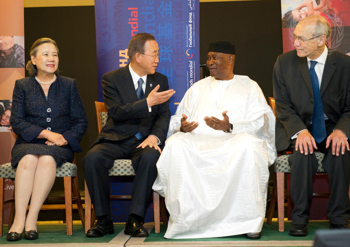 Secretary-General Ban Ki-moon (second from left) chats with Amadou Toumani Touré, President of the Republic of Mali, during the Global Fund to Fight AIDS, Tuberculosis and Malaria’s exhibit opening and reception at UN Headquarters. Also pictured are Yoo Soon-taek (left), Mr. Ban’s wife, and Richard Manning, the Fund’s Replenishment Vice-Chair.