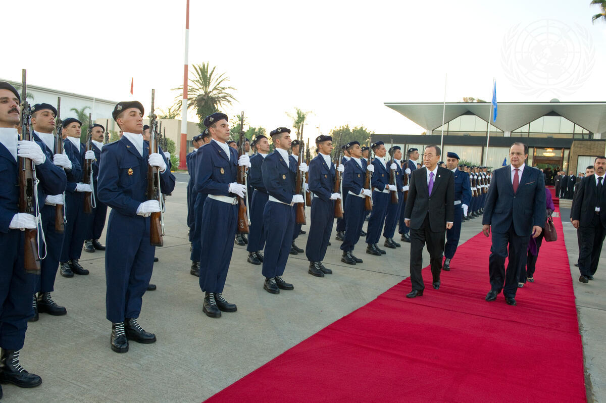 Shortly before his departure, Secretary-General Ban Ki-moon (left) is led by Moroccan Foreign Minister Taïb Fassi Fihri (beside Mr. Ban) to the Royal Pavilion at the airport in Rabat, Morocco, for a formal send-off.