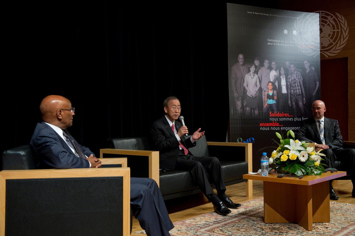 Secretary-General Ban Ki-moon (centre) holds a town hall meeting with UN staff members in Rabat, Morocco, joined by Taye-Brook Zerihoun (left), Assistant Secretary-General for Political Affairs, and Bruno Pouezat, UN Resident Coordinator and Resident Representative of the UN Development Program (UNDP) in Morocco.