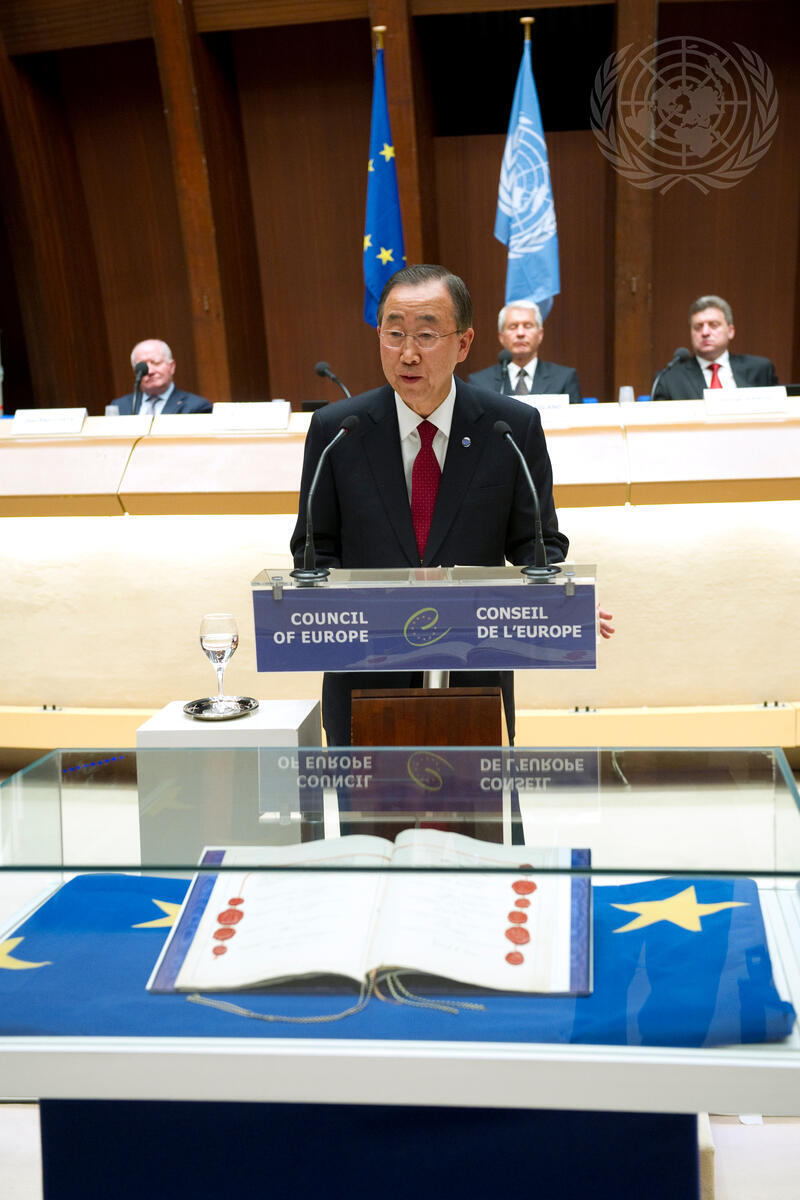 Secretary-General Ban Ki-moon addresses the Council of Europe at its 60th anniversary commemoration of the European Convention on Human Rights in Strasbourg, France.
