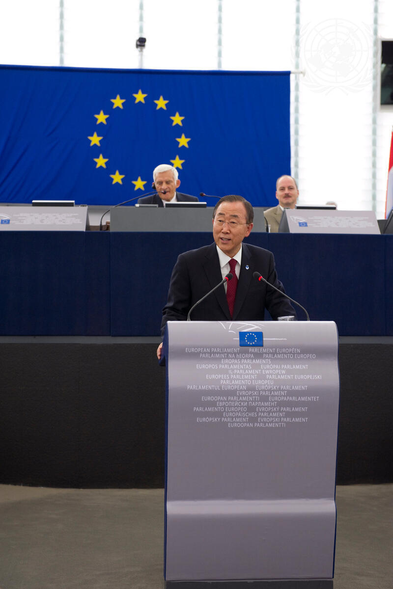 Secretary-General Ban Ki-moon addresses the European Parliament at its 60th anniversary commemoration of the European Convention on Human Rights in Strasbourg, France.