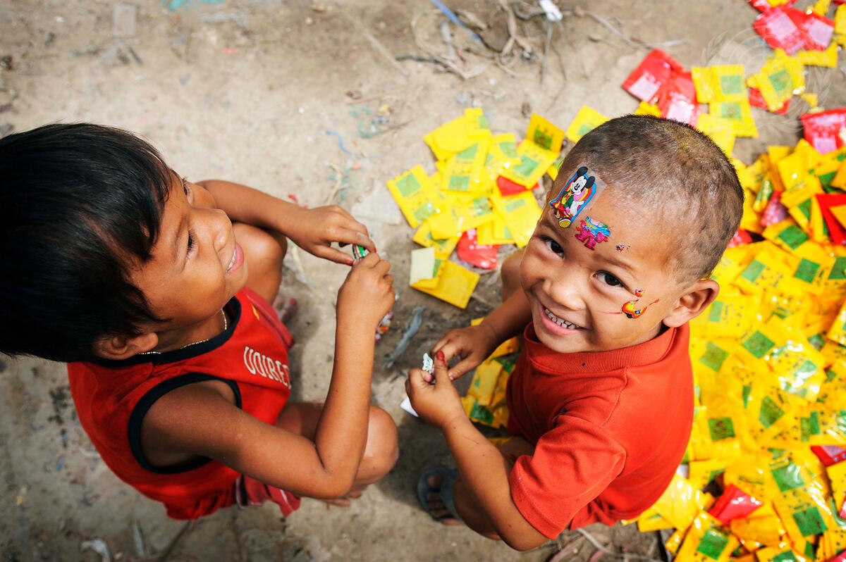Children play with garbage in Phnom Penh’s Stung Meanchey slums, where some 2000 people live on the garbage dump and make their living selling recyclable refuse. According to the UN Millennium Development Goals Report 2007, one billion people, or roughly one out of three urban dwellers, live in slum conditions.