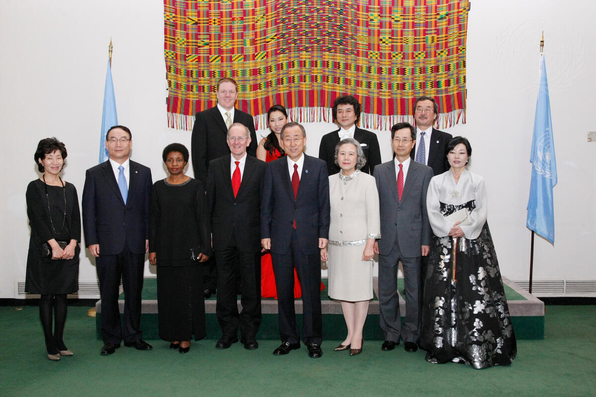 Secretary-General Ban Ki-moon (fourth from right) and his wife, Yoo Soon-taek (right of Mr. Ban), pose for a group photo with participants of the 2010 UN Day Concert, sponsored by the Permanent Mission of the Republic of Korea to the United Nations and featuring the Korean Broadcasting System (KBS) Symphony Orchestra and the Westminster Choir College Symphonic Choir. Front row (from right): Kim Mee Young, wife of Park In-Kook, Permanent Representative of the Republic of Korea to the UN; Mr. Park; Joseph Deiss, President of the sixty-fifth session of the General Assembly; Deputy Secretary-General Asha-Rose Migiro; and Kim In Kyu, President and Chief Executive Officer of KBS. Back frow (from right): Kiyotaka Akasaka, Under-Secretary-General for Communications and Public Information and master of ceremonies for the concert; Shinik Hahm, Chief Conductor of the KBS Symphony Orchestra; Sarah Chang, world renowned violinist; and Joe Miller, Conductor of the Westminster Choir.