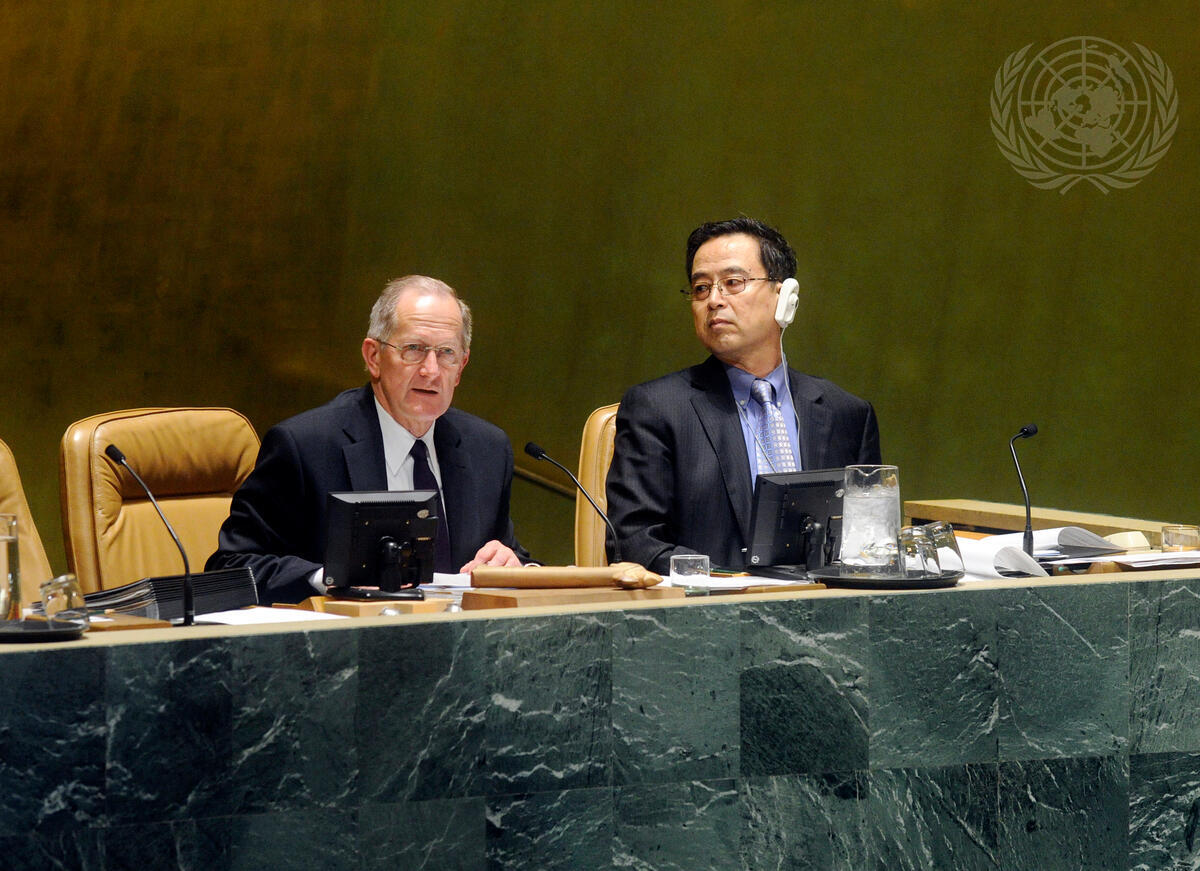 Joseph Deiss (left), President of the sixty-fifth session of the General Assembly, chairs a meeting of the Assembly on the Economic and Social Council (ECOSOC)’s report of the implementation and follow-up to outcomes of major UN conferences in the social and economic fields. At its meeting the Assembly also adopted a consensus resolution proclaiming the first week of February of every year World Interfaith Harmony Week.