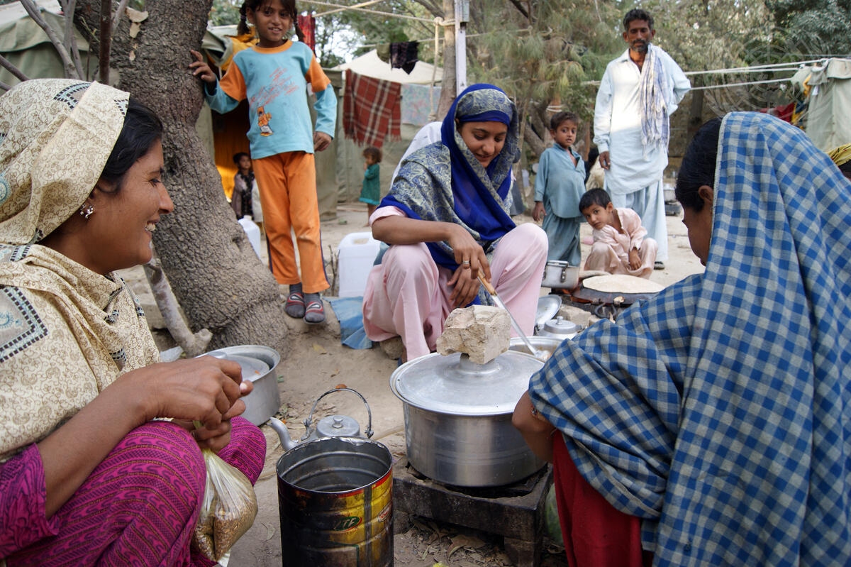 Families cook their meal inside a tent camp in Quetta, Balochistan Province, Pakistan, where thousands have been displaced following massive floods that began in July 2010.