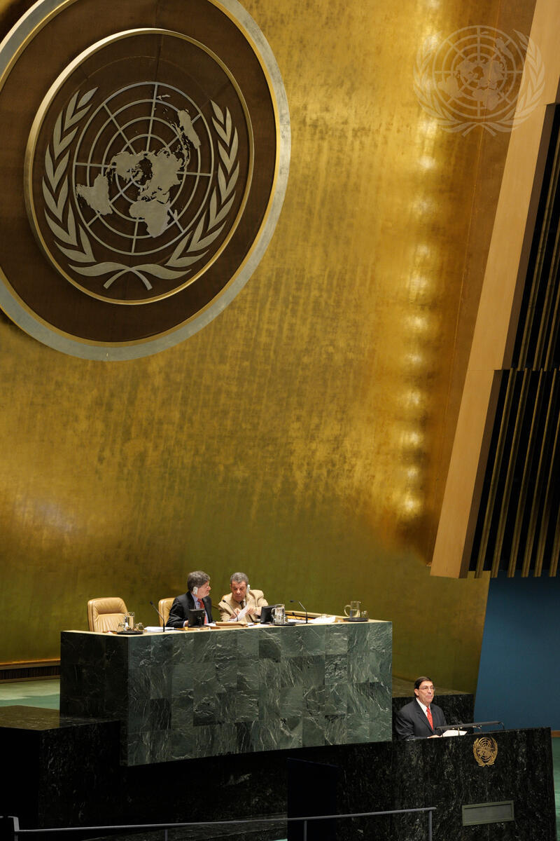A view inside the General Assembly Hall as Bruno Rodríguez Parrilla (at podium), Minister for Foreign Affairs of Cuba, addresses the Assembly at its annual meeting on the necessity of ending the economic, commercial and financial embargo imposed by the United States of America against Cuba. For the 19th straight year, the Assembly adopted a resolution on the issue, with 187 Members voting in favour, 3 Members abstaining, and 2, including the United States, voting against.