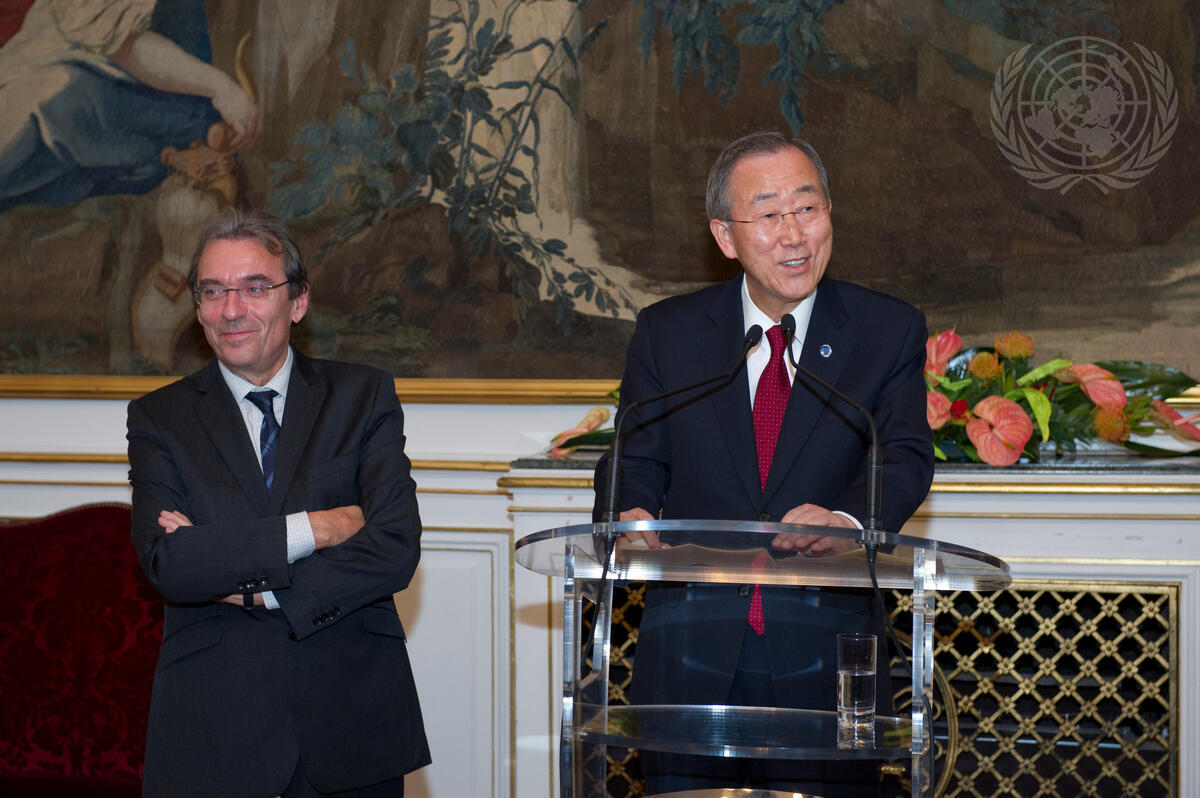 Secretary-General Ban Ki-moon addresses a ceremony in his honour at Strasbourg’s City Hall, France, at which he received the Honour Medal of the city. Standing left of Mr. Ban is Roland Ries, Mayor of Strasbourg.