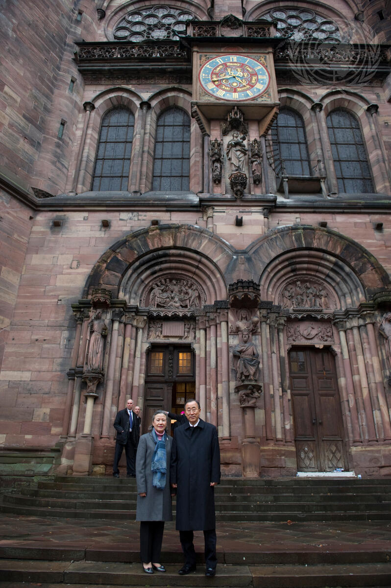 Secretary-General Ban Ki-moon and his wife, Yoo Soon-taek, pose for a photograph outside the Cathedral of Notre Dame, in Strasbourg, France.