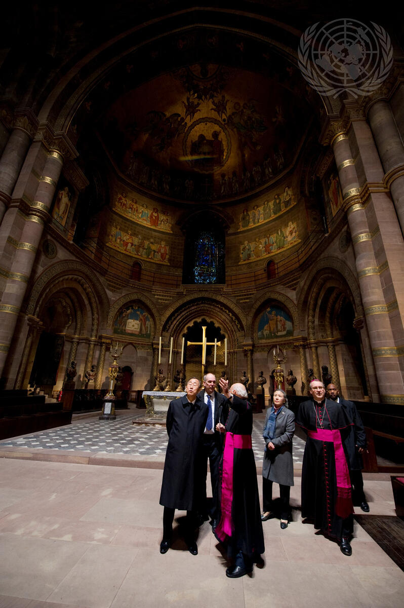 Secretary-General Ban Ki-moon (left) and his wife, Yoo Soon-taek (third from right), are given a tour of the Cathedral of Notre Dame, in Strasbourg, France.