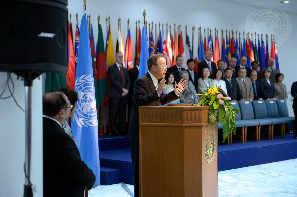 Secretary-General Ban Ki-moon addresses staff members of the United Nations Economic and Social Commission for Asia and the Pacific (ESCAP) at the ESCAP Building in Bangkok, Thailand.