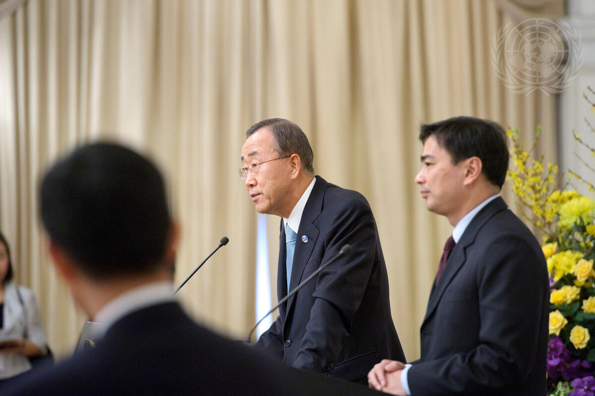 Secretary-General Ban Ki-moon (left) holds a joint press conference with Thai Prime Minister Abhisit Vejjajiva (right) following their meeting at the at the Government House complex in Bangkok, Thailand.