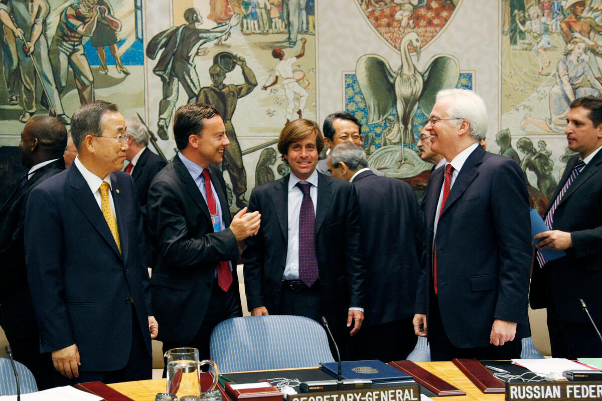Vitaly I. Churkin (right), Permanent Representative of the Russian Federation to the UN and President of the Security Council for August; Nicolas de Rivière (second from right), Deputy Permanent Representative of France to the UN; and Secretary-General Ban Ki-moon (left) share; a conversation prior to the Security Council's meeting on piracy off the coast of Somalia.