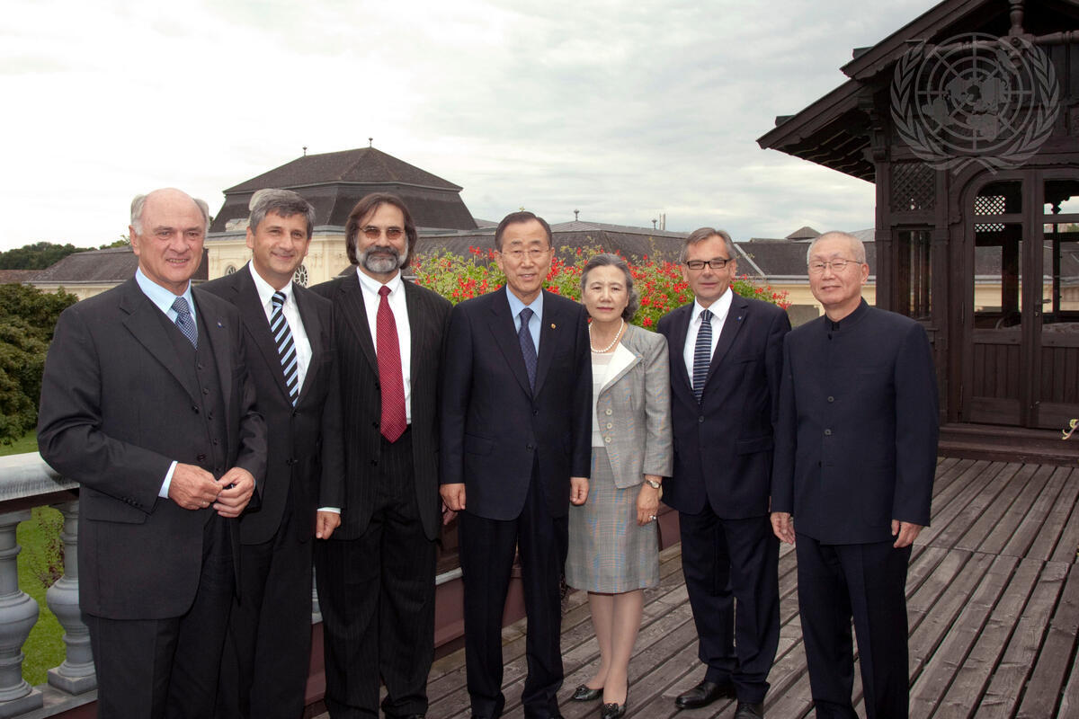 Secretary-General Ban Ki-moon (centre), accompanied by his wife, Yoo Soon-taek (right of Mr. Ban), meets with Chin-Min Lee (right), Director of the International Institute for Applied Systems Analysis (IIASA), and Nebojsa Nakicenovic (third from left), IIASA Deputy Director, at the Institute near Vienna, Austria. Also pictured are Erwin Pröll (left), Governor of Lower Austria, and Michael Spindelegger (second from left), Austrian Federal Minister for European and International Affairs.