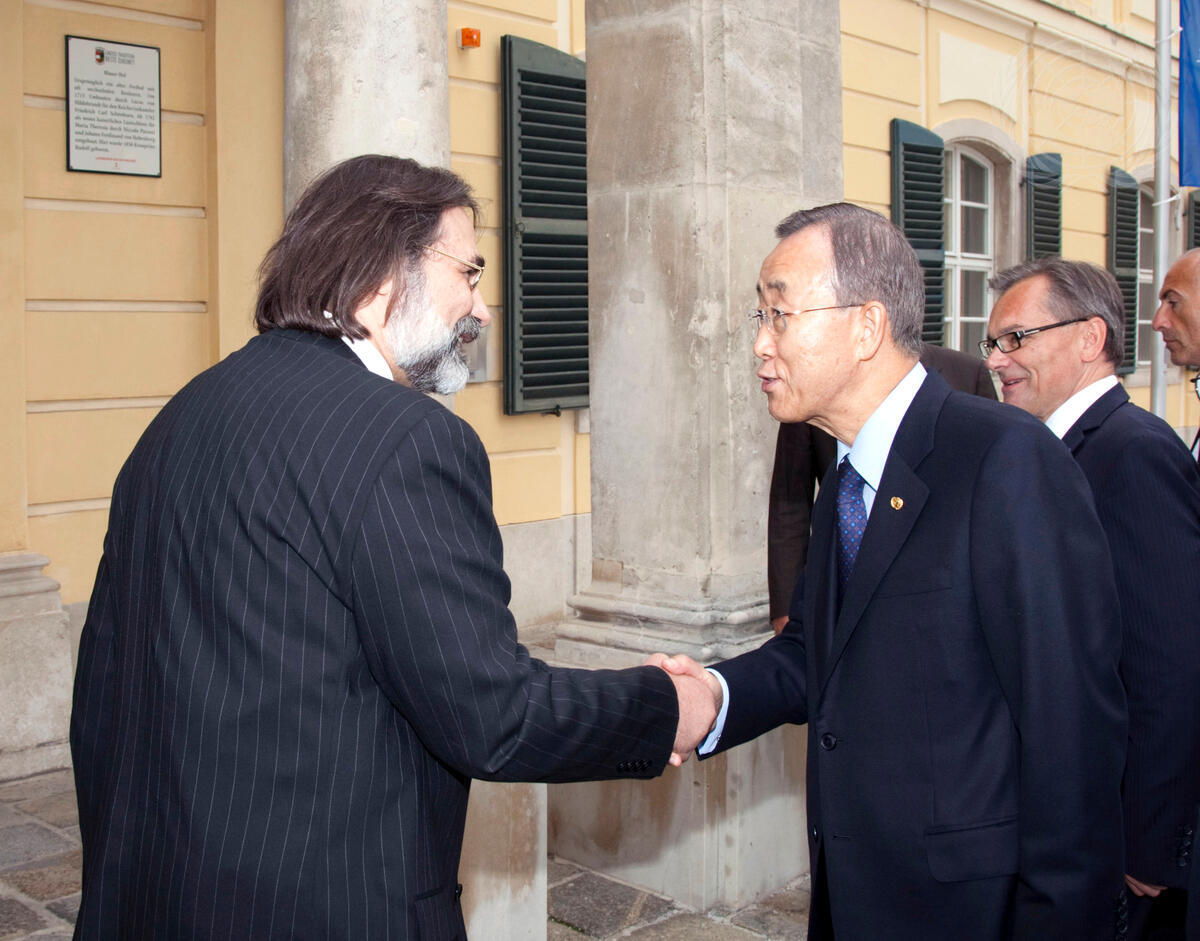 Secretary-General Ban Ki-moon (centre) is greeted by Nebojsa Nakicenovic, Deputy Director of the International Institute for Applied Systems Analysis (IIASA), as he arrives for his visit to the Institute in Laxenburg, Austria.