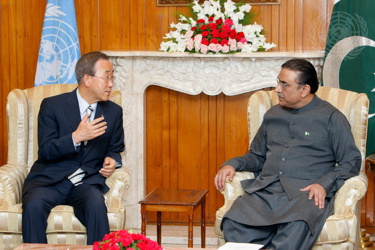 Secretary-General Ban Ki-moon (left) meets with Asif Ali Zardari, President of Pakistan, at the Presidential Palace in Pakistani capital, Islamabad.