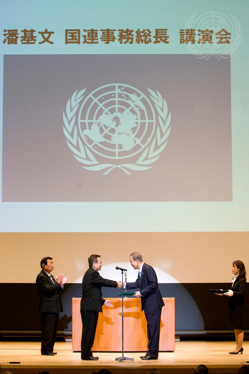 Secretary-General Ban Ki-moon (front, right) receives a honourary Hiroshima Citizenship Award from Mayor Tadatoshi Akiba at a citizens' welcome ceremony in Hiroshima, Japan.