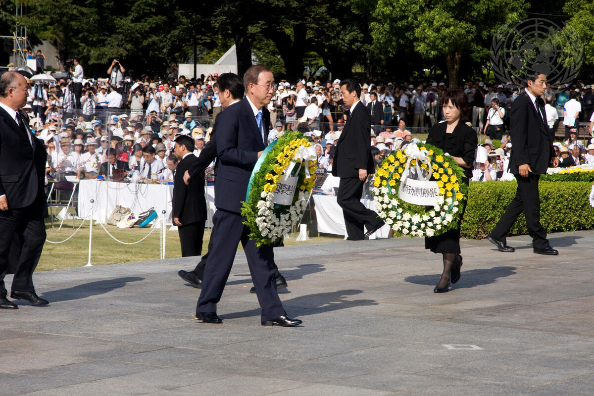 Secretary-General Ban Ki-moon carries a wreath for the victims of the 1945 atomic bombing on Hiroshima, at the Hiroshima Peace Memorial Ceremony, Japan.
