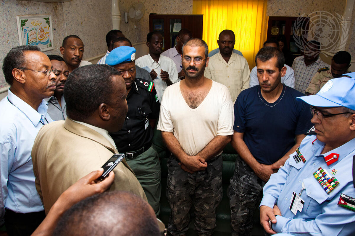 Two Jordanian peacekeepers (second from right, third from right) of the African Union-United Nations Hybrid Operation in Darfur (UNAMID) are met by Mohamed Yonis (left), Deputy Joint African Union-United Nations Representative for Operations and Management, upon their release from four days of captivity, in Nyala, Sudan. Also pictured is UNAMID Acting Police Commissioner Adeyemi Ogunjemilusi (fourth from right).