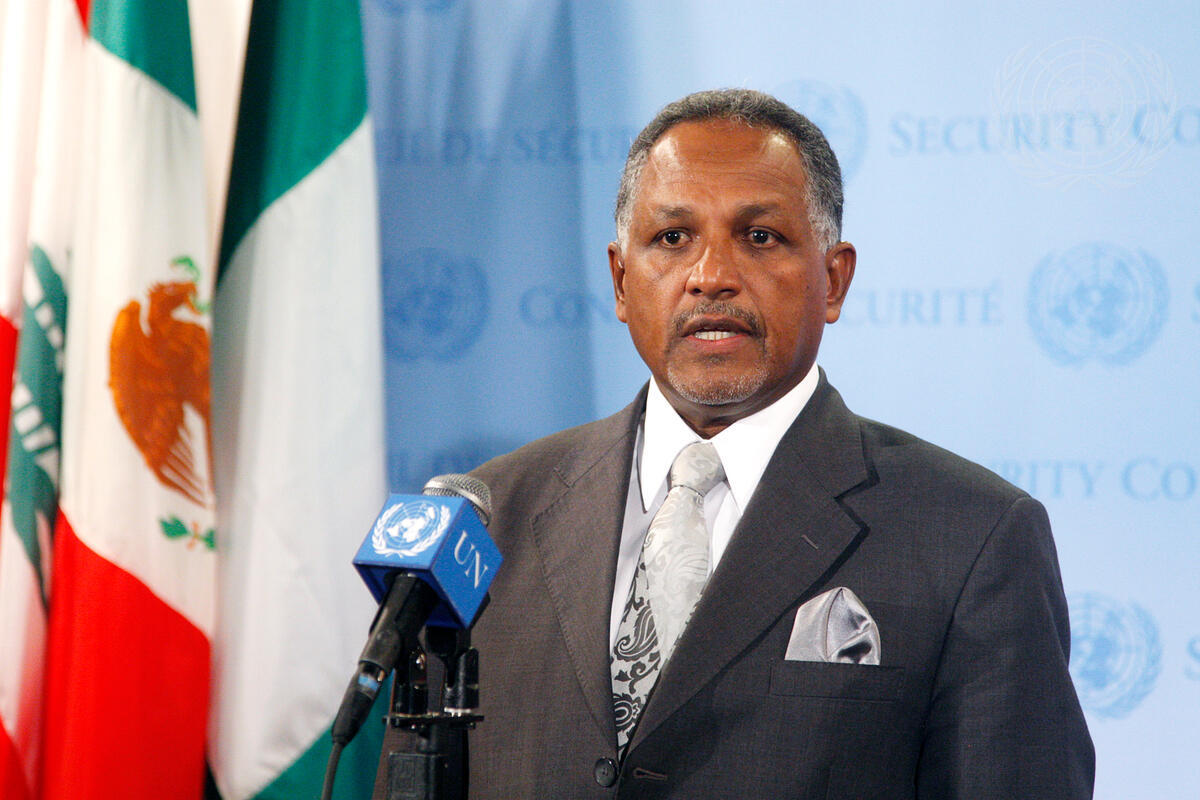 Daffa-Alla Elhag Ali Osman, Permanent Representative of the Republic of the Sudan to the UN, briefs correspondents following Security Council consultations on his country.