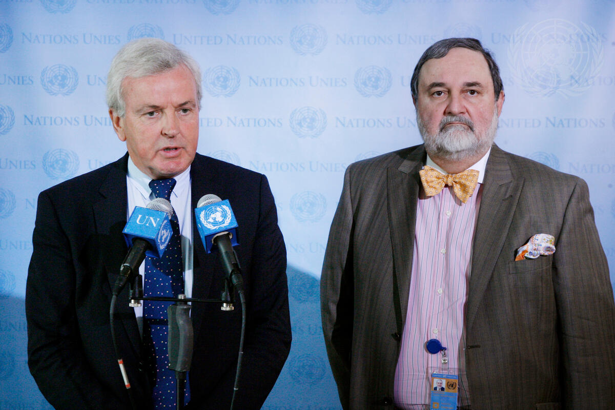 John Holmes, Under-Secretary-General for Humanitarian Affairs and Emergency Relief Coordinator, briefs correspondents following the launch of a humanitarian response plan for Pakistan, where an estimated 14 million people have been affected by severe floods. Almost $460 million has been requested for relief support.